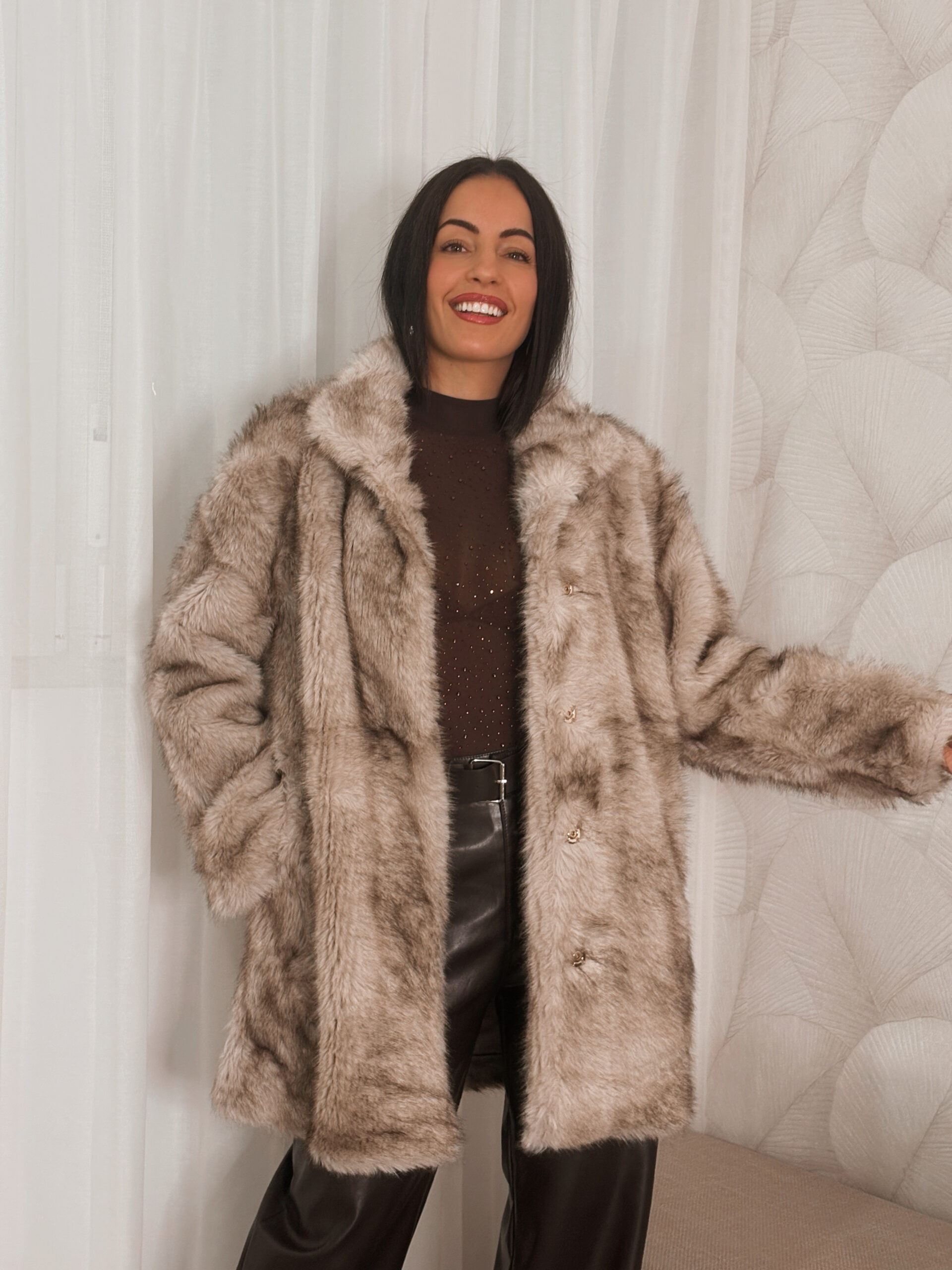 Nuestro Abrigo Tres Cuartos Efecto Visón en color crema combina elegancia, suavidad y comodidad en una sola prenda. Confeccionada en un pelo sintético, su textura es agradable y suave.